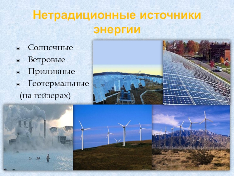 Нетрадиционные источники энергииСолнечные ВетровыеПриливныеГеотермальные (на гейзерах)