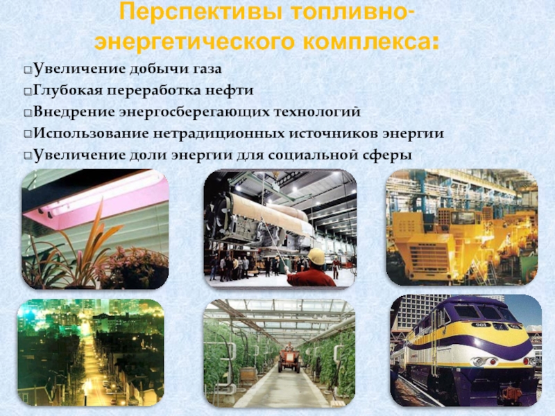 Перспективы топливно-энергетического комплекса: Увеличение добычи газаГлубокая переработка нефтиВнедрение энергосберегающих технологийИспользование