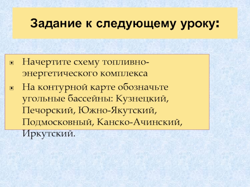 Задание к следующему уроку:Начертите схему топливно-энергетического комплексаНа контурной карте обозначьте угольные бассейны: Кузнецкий, Печорский, Южно-Якутский, Подмосковный, Канско-Ачинский,
