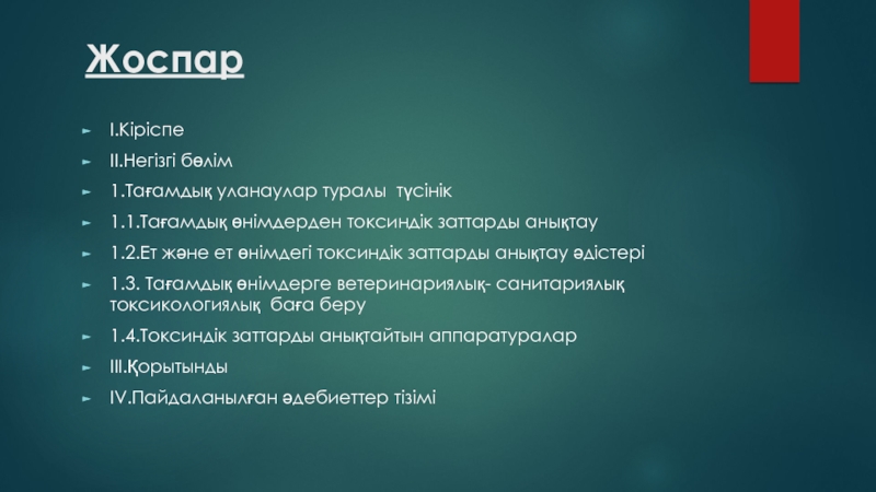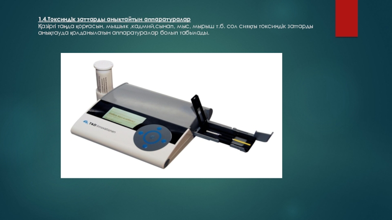 Слайд 1Тағамдық өнімдердегі токсиндік затты анықтауда қолданылатын заманауи әдістермен техникалық аппаратуралар