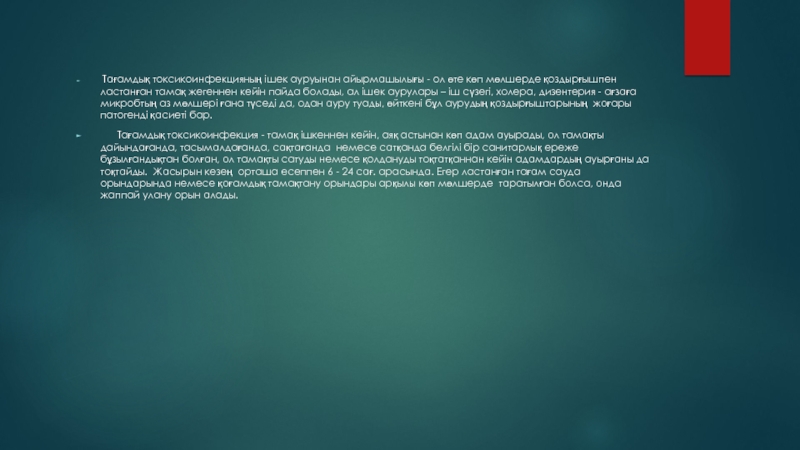 Слайд 5 Тағамдық токсикоинфекцияның ішек ауруынан айырмашылығы - ол өте көп
