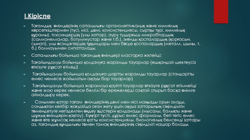 Тағамдық өнімдерінің сапалылығы органолептикалық және химиялық көрсеткіштермен (түсі, иісі, дәмі,