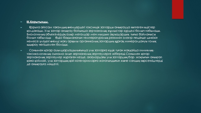 Қорыта айтсам тағамдық өнімдердегі токсиндік заттарды анықтауда көптеген