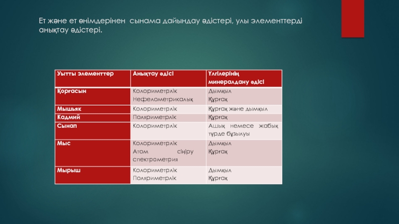 Слайд 9Ет және ет өнімдерінен сынама дайындау әдістері, улы элементтерді анықтау
