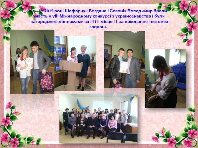 Созонік Володимир 2015р. ІІ місце у VІІІ Міжнародному конкурсі з українознавства і І місце за виконання тестових завдань.