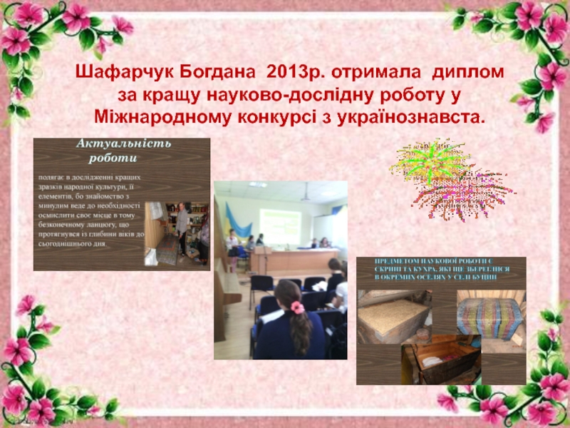 Шафарчук Богдана 2013р. отримала диплом за кращу науково-дослідну роботу у Міжнародному конкурсі з українознавста.