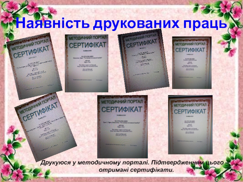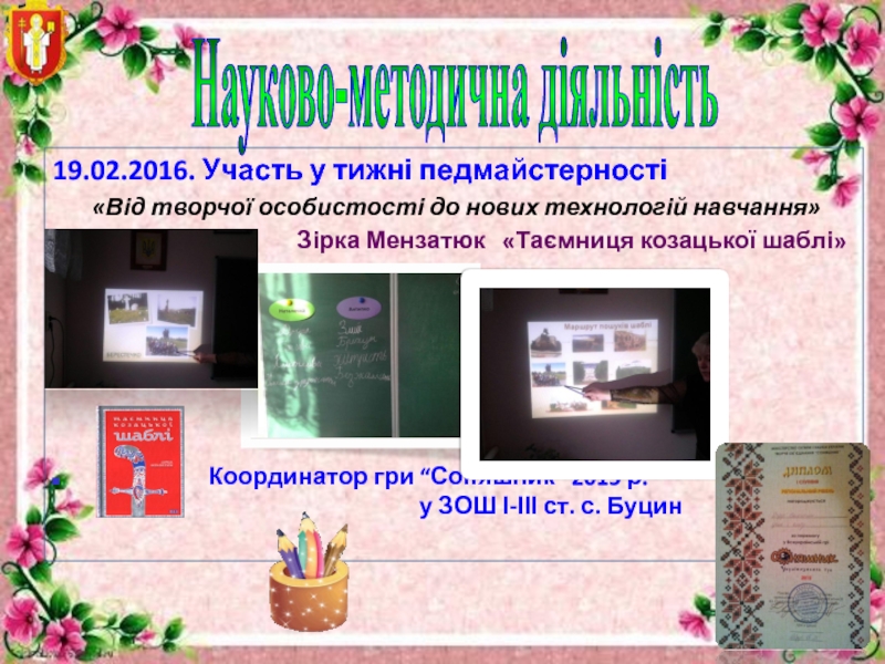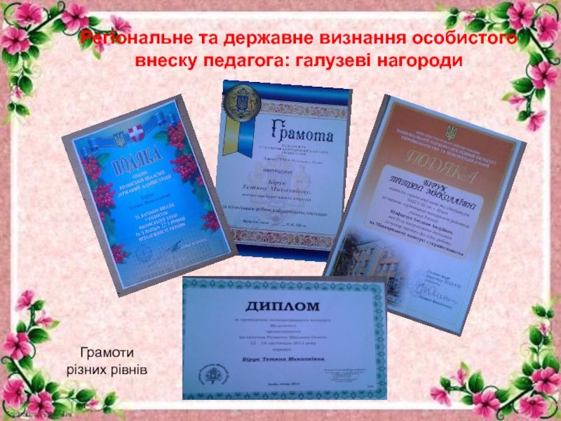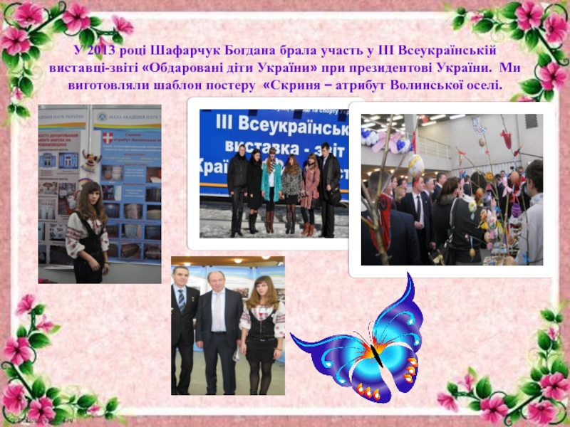 Шафарчук Богдана 2013р. Нагороджена дипломом за участь у ІІІ Всеукраїнській виставці - звіті дитячої творчості «Країна юних майстрів».