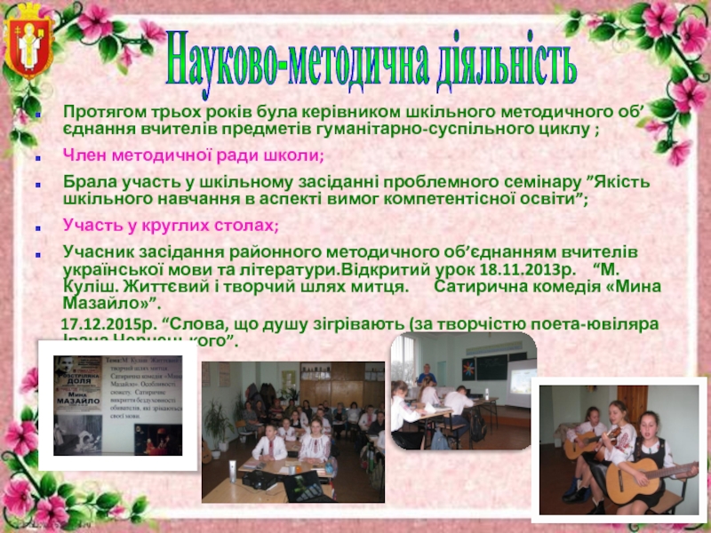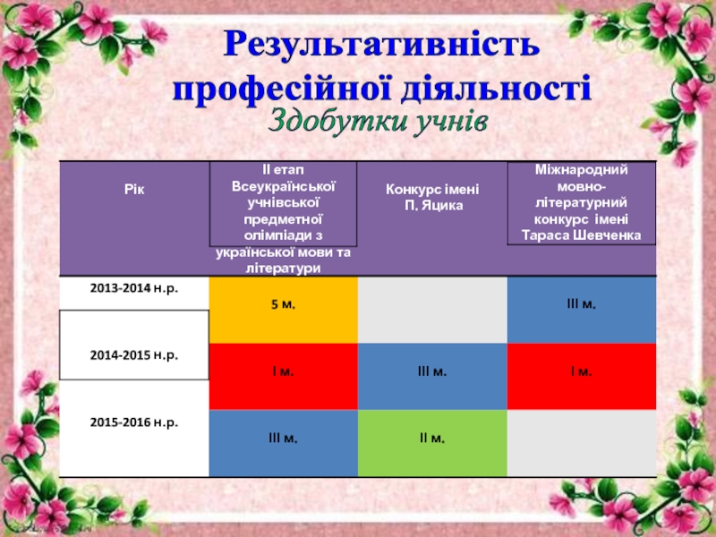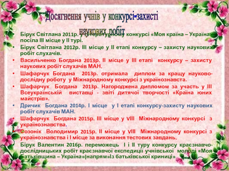 Шафарчук Богдана 2015р. ІІІ місце у VІІІ Міжнародному конкурсі з українознавства.