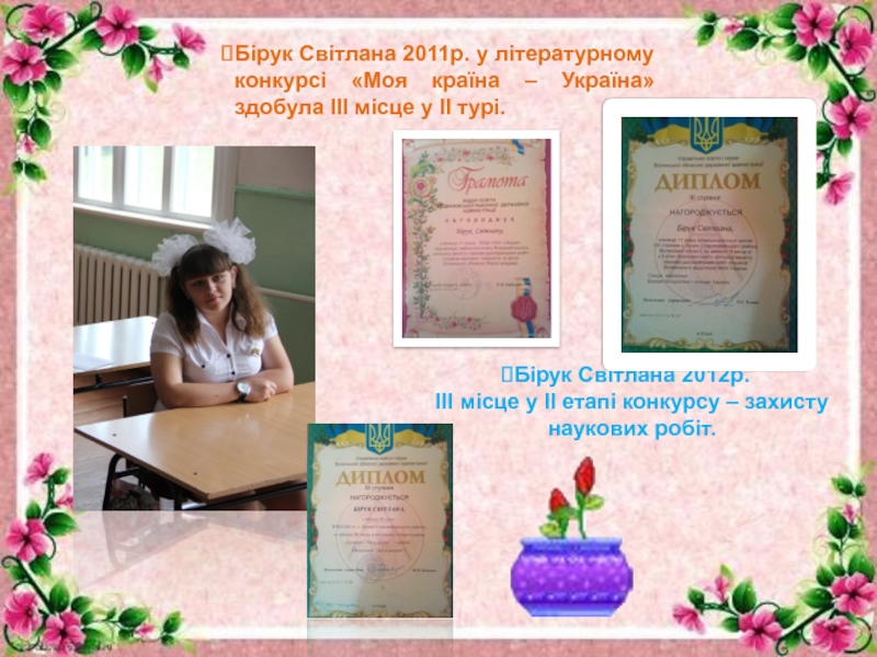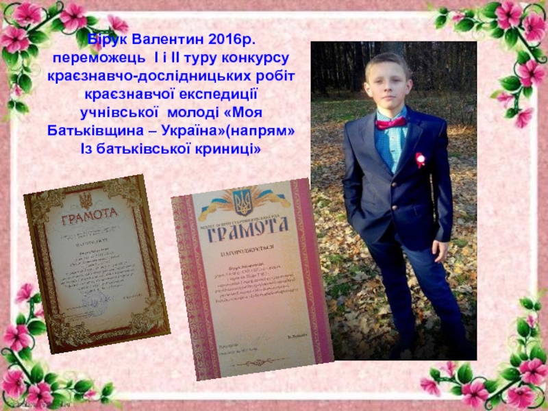 Бірук Валентин 2016р. переможець І і ІІ туру конкурсу краєзнавчо-дослідницьких робіт краєзнавчої експедиції учнівської молоді «Моя Батьківщина – Україна»(напрям»Із батьківської криниці»