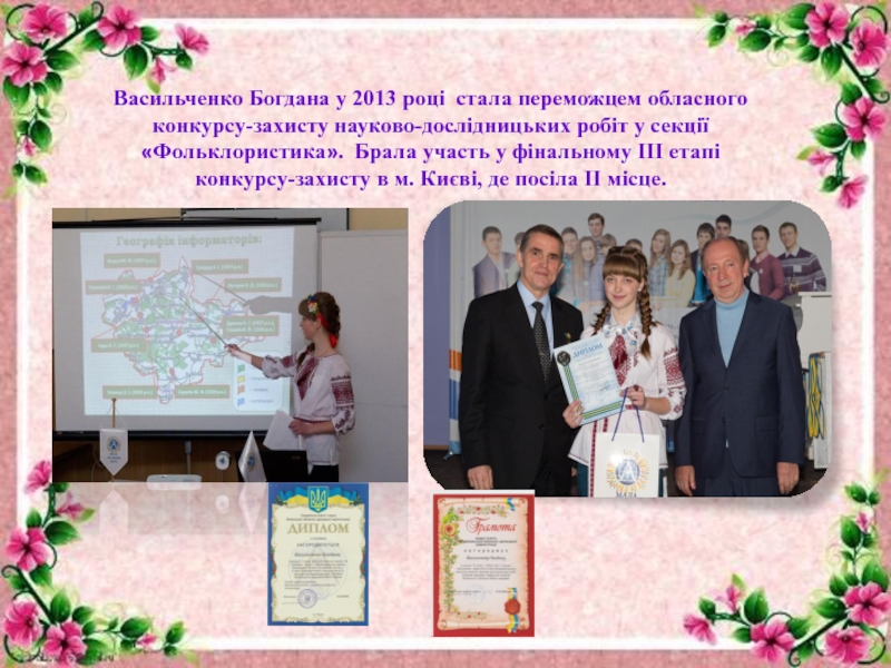 Васильченко Богдана 2013р. ІІ місце у ІІІ етапі конкурсу – захисту наукових робіт слухачів МАН.