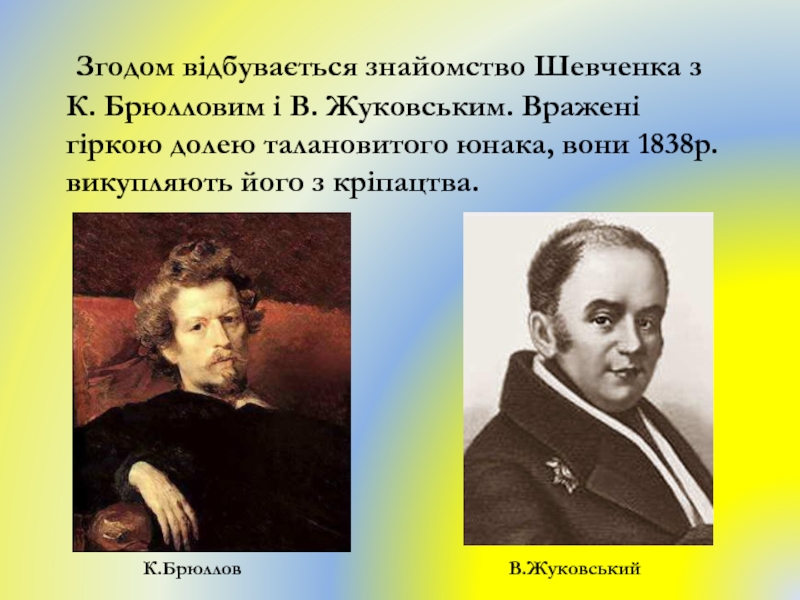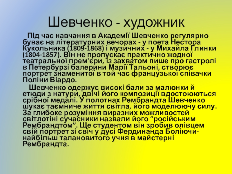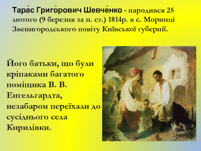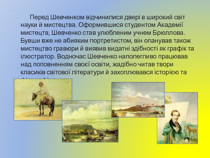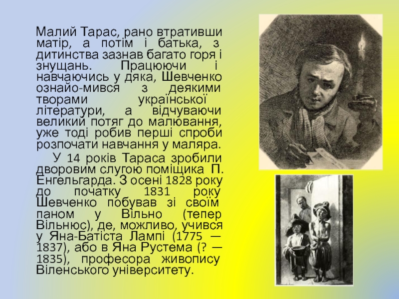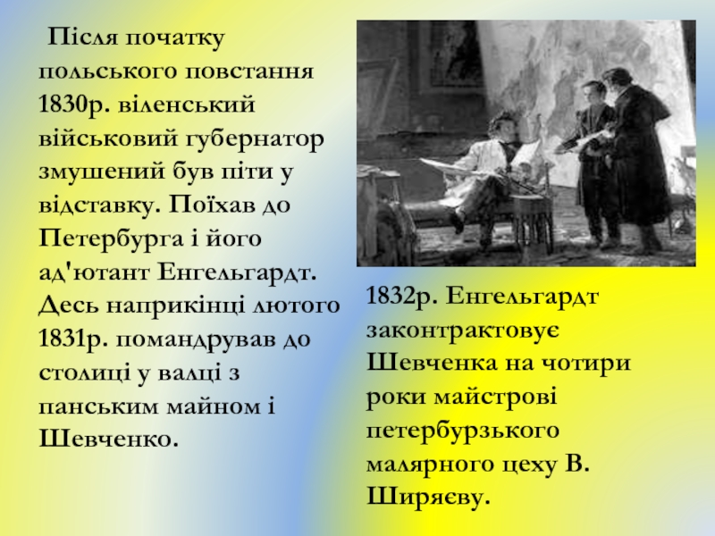 1832р. Енгельгардт законтрактовує Шевченка на чотири роки майстрові петербурзького малярного цеху В. Ширяєву.