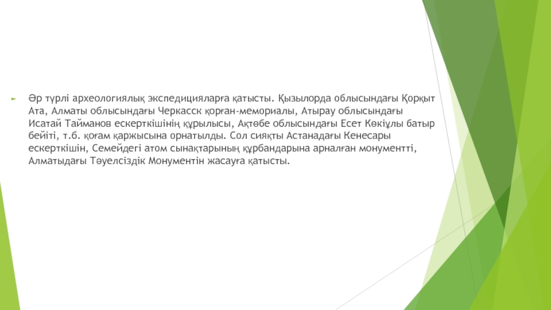 Слайд 5Әр түрлі археологиялық экспедицияларға қатысты. Қызылорда облысындағы Қорқыт Ата, Алматы