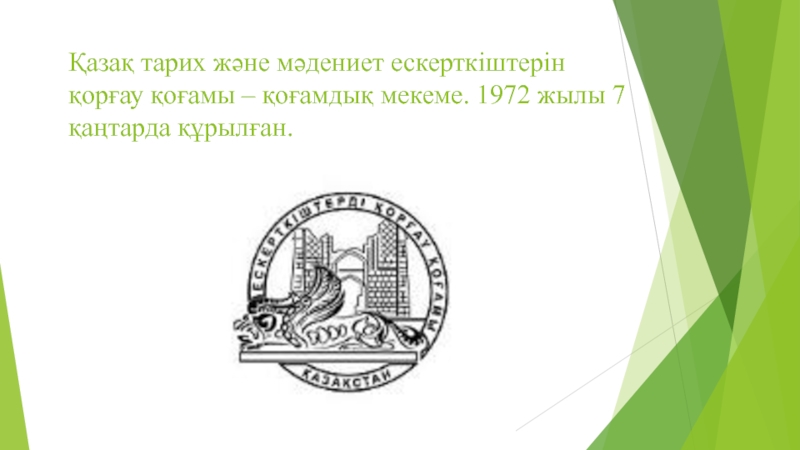 Слайд 2Қазақ тарих және мәдениет ескерткіштерін қорғау қоғамы – қоғамдық мекеме.