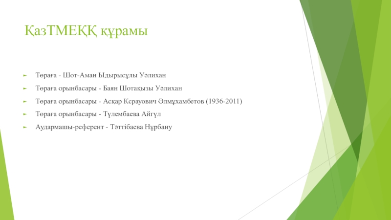 ҚазТМЕҚҚ құрамы Төраға - Шот-Аман Ыдырысұлы УәлиханТөраға орынбасары - Баян Шотақызы УәлиханТөраға орынбасары - Асқар Ксрауович Әлмұхамбетов
