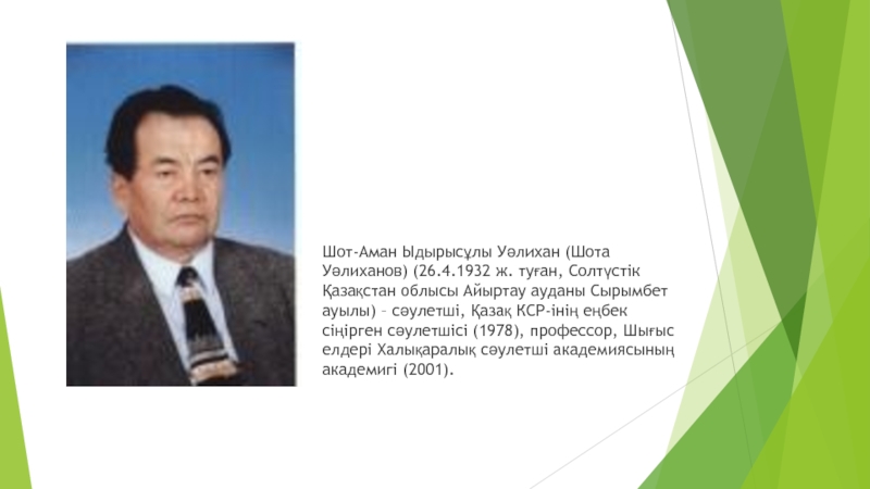 Слайд 9Шот-Аман Ыдырысұлы Уәлихан (Шота Уәлиханов) (26.4.1932 ж. туған, Солтүстік Қазақстан