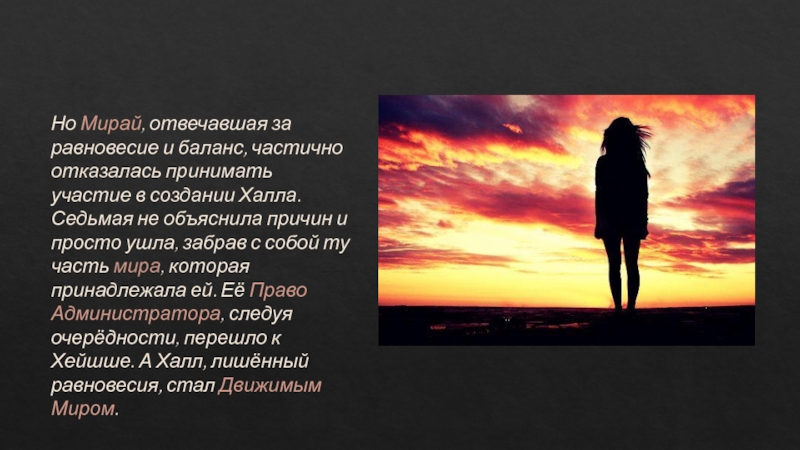 Слайд 8Но Мирай, отвечавшая за равновесие и баланс, частично отказалась принимать