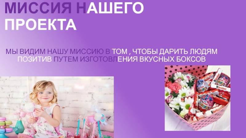 МЫ ВИДИМ НАШУ МИССИЮ В ТОМ , ЧТОБЫ ДАРИТЬ ЛЮДЯМ ПОЗИТИВ ПУТЕМ ИЗГОТОВЛЕНИЯ ВКУСНЫХ БОКСОВ