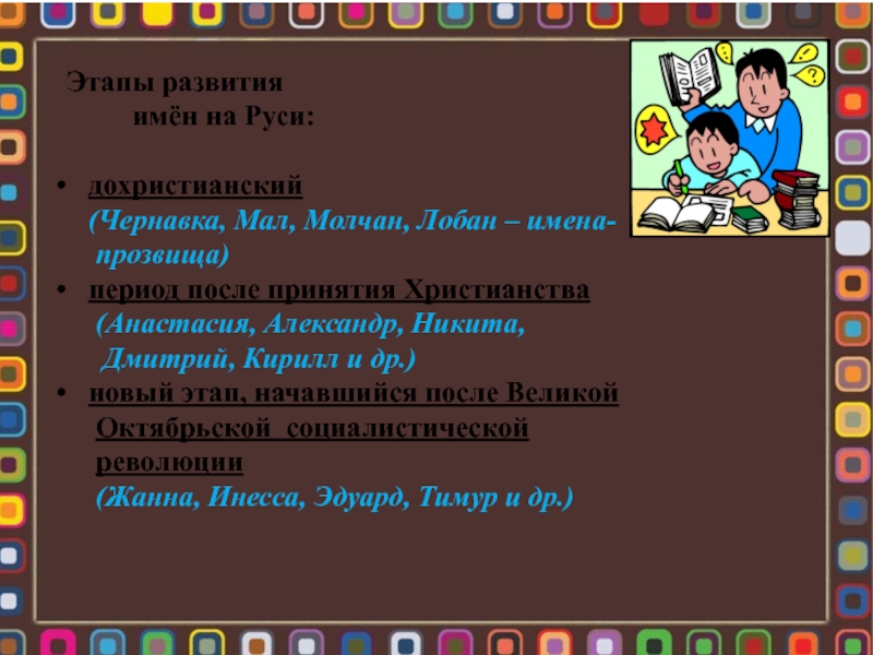 историю. Они возникают, изменяются, исчезают. История русских имен очень давняя