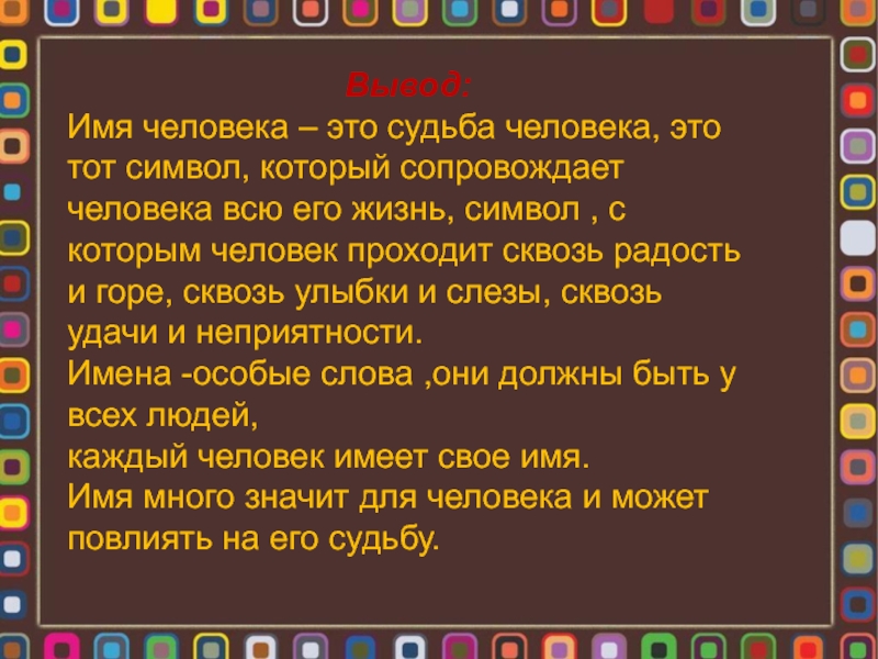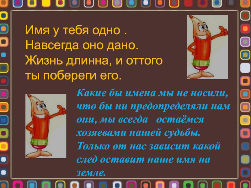 Важно помнить, что имя – это не наряд, который можно надевать по праздникам, можно подарить или выбросить. Значение имени - часть личности, дается оно только единожды и сопровождает человека всю жизнь.