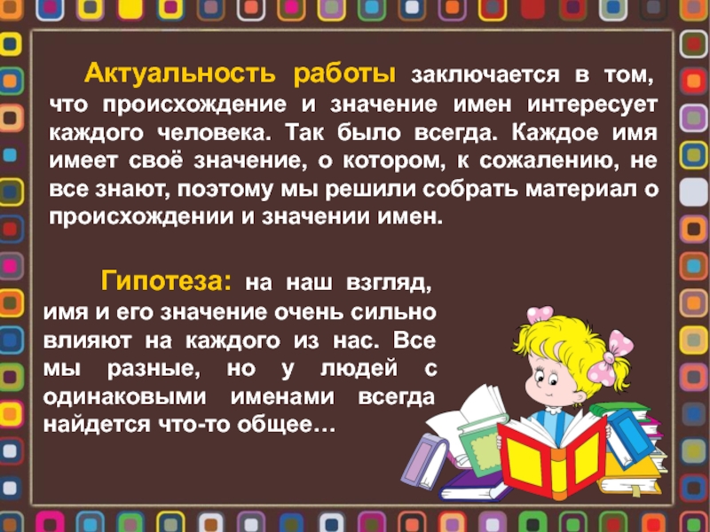 Слайд 3Актуальность работы заключается в том, что происхождение и значение имен