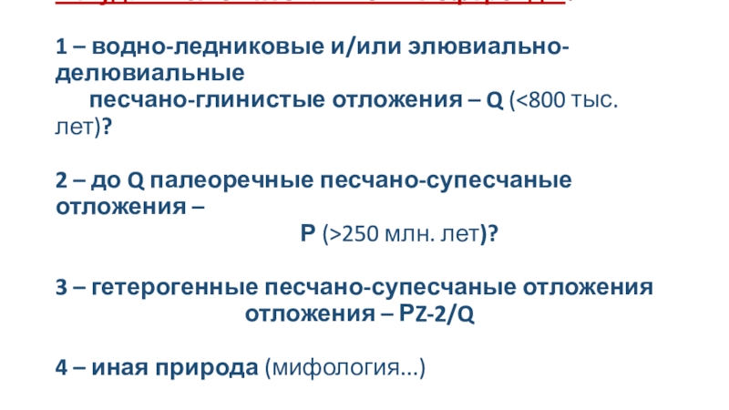 палеоречные песчано-супесчаные отложения – Р (>250 млн. лет)? 3 – гетерогенные песчано-супесчаные отложения отложения – РZ-2/Q 4 – иная природа (мифология...)