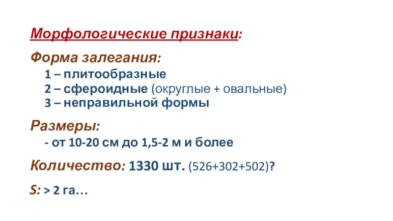 Слайд 9Морфологические признаки: Форма залегания: 1 – плитообразные 2 – сфероидные (округлые + овальные) 3