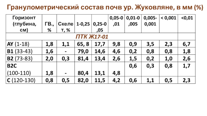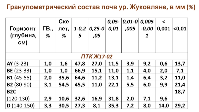 Слайд 38Гранулометрический состав почв ур. Жуковляне, в мм (%)