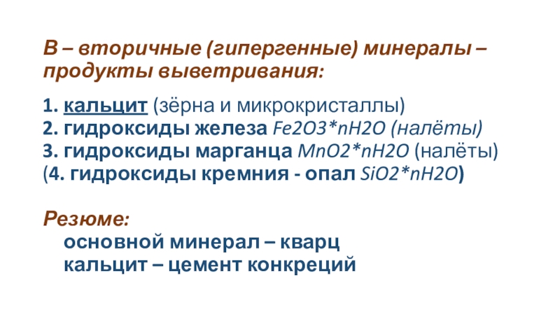 В – вторичные (гипергенные) минералы – продукты выветривания:   1. кальцит (зёрна и микрокристаллы) 2. гидроксиды