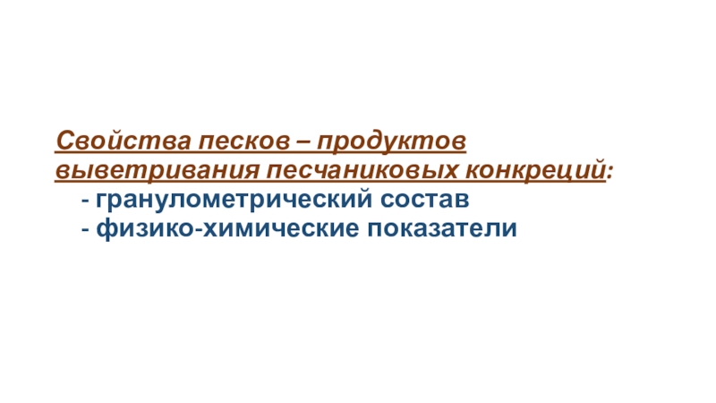Свойства песков – продуктов выветривания песчаниковых конкреций:  	- гранулометрический состав 	- физико-химические показатели