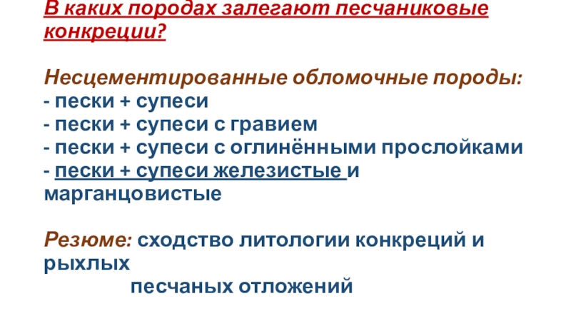 В каких породах залегают песчаниковые конкреции?  Несцементированные обломочные породы: - пески + супеси - пески +