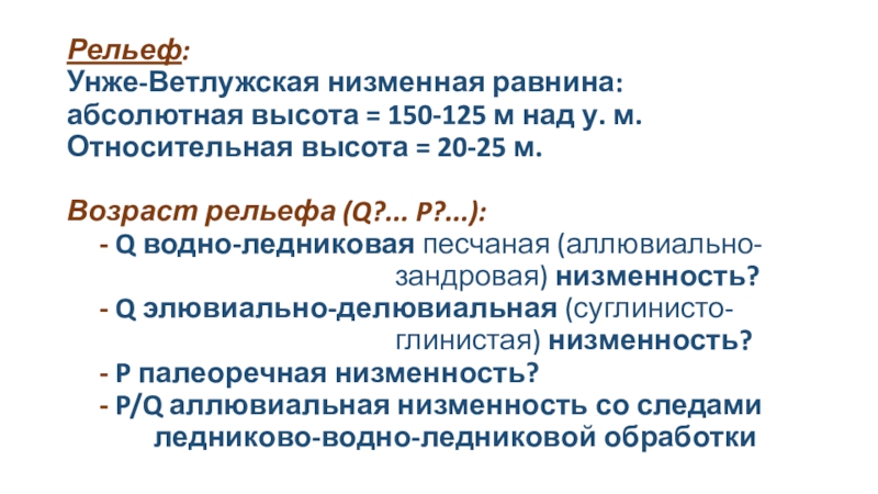 водно-ледниковая песчаная (аллювиально- зандровая) низменность? - Q элювиально-делювиальная (суглинисто- глинистая) низменность? - P палеоречная низменность? - P/Q аллювиальная низменность со следами ледниково-водно-ледниковой обработки