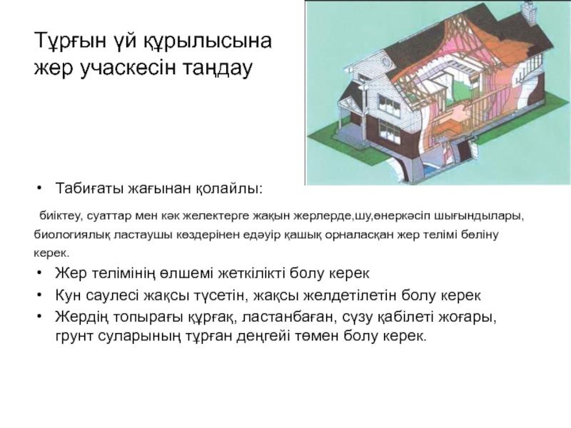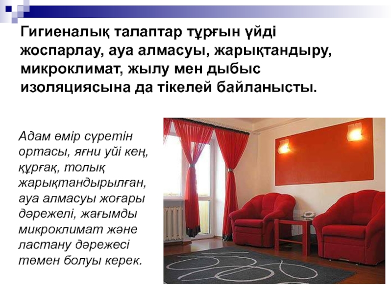 Слайд 7Гигиеналық талаптар тұрғын үйді жоспарлау, ауа алмасуы, жарықтандыру, микроклимат, жылу