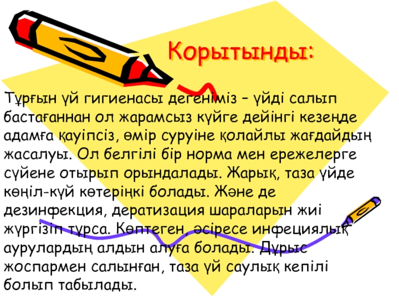Слайд 15Тұрғын үй гигиенасымен қатар осы уйдің тұрғындарының жеке бас гигиенасы