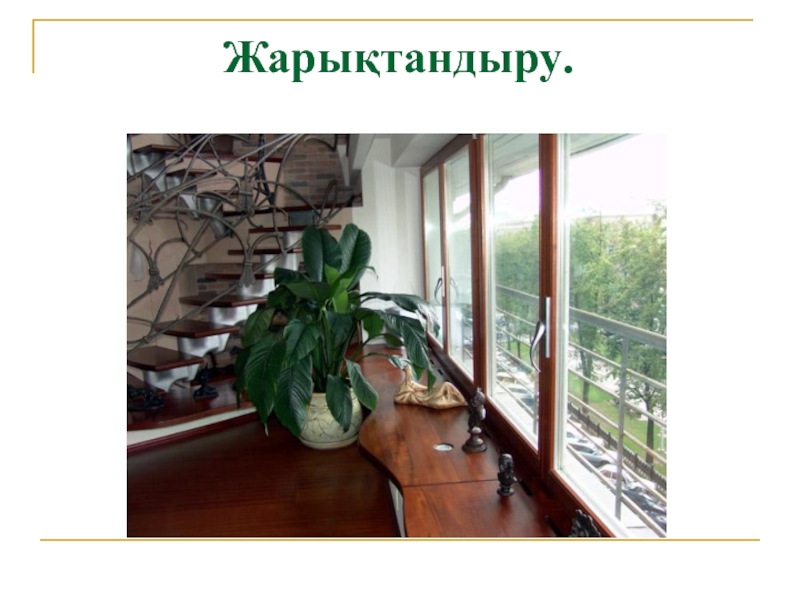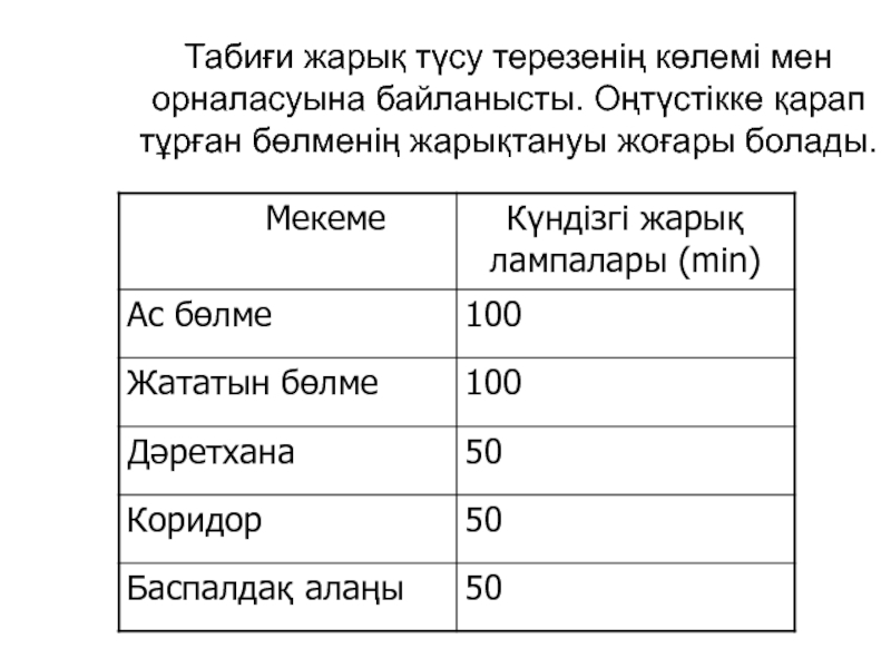 Слайд 12Табиғи жарық түсу терезенің көлемі мен орналасуына байланысты. Оңтүстікке қарап