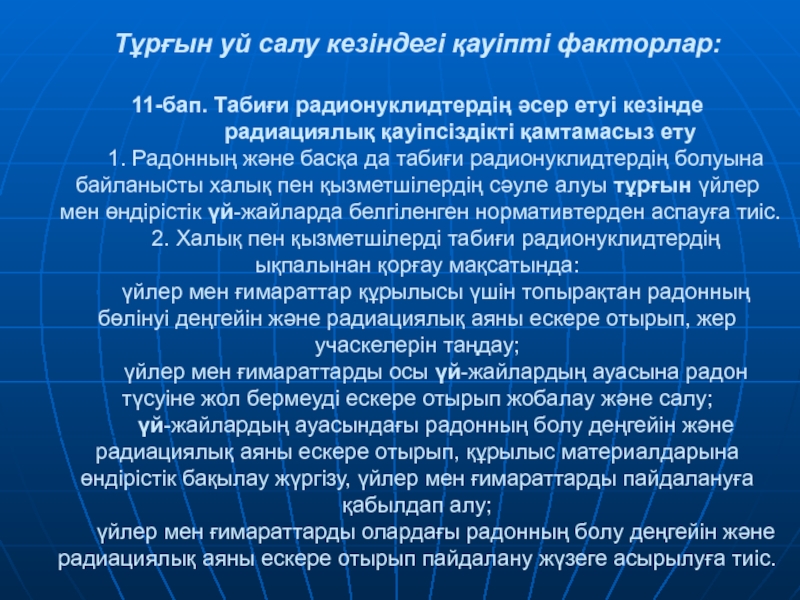 Слайд 63. Үйлер мен ғимараттардағы радонның болу деңгейiн және радиациялық аяны