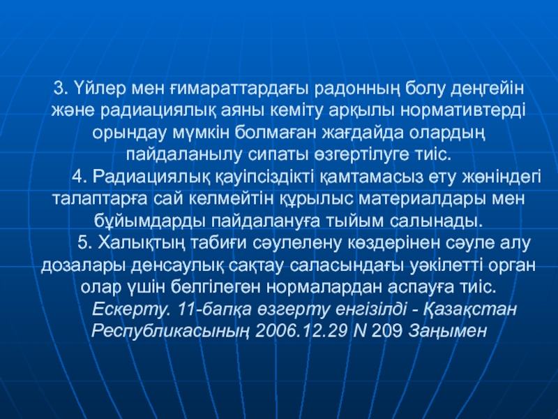 табиғи радионуклидтердiң болуына байланысты халық пен қызметшiлердiң сәуле алуы тұрғын үйлер мен өндiрiстiк үй-жайларда белгiленген нормативтерден аспауға тиiс.