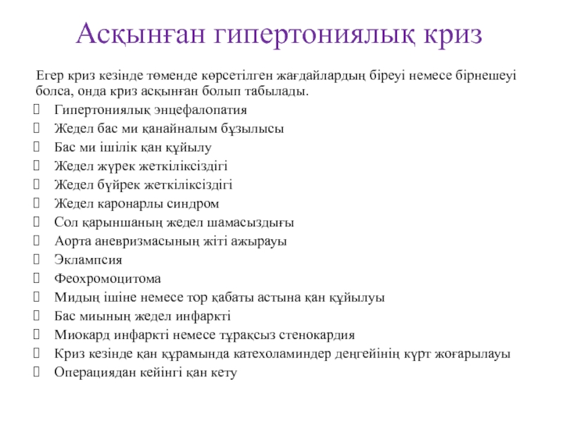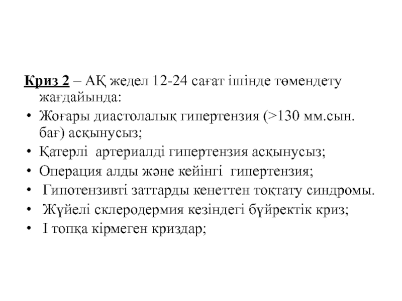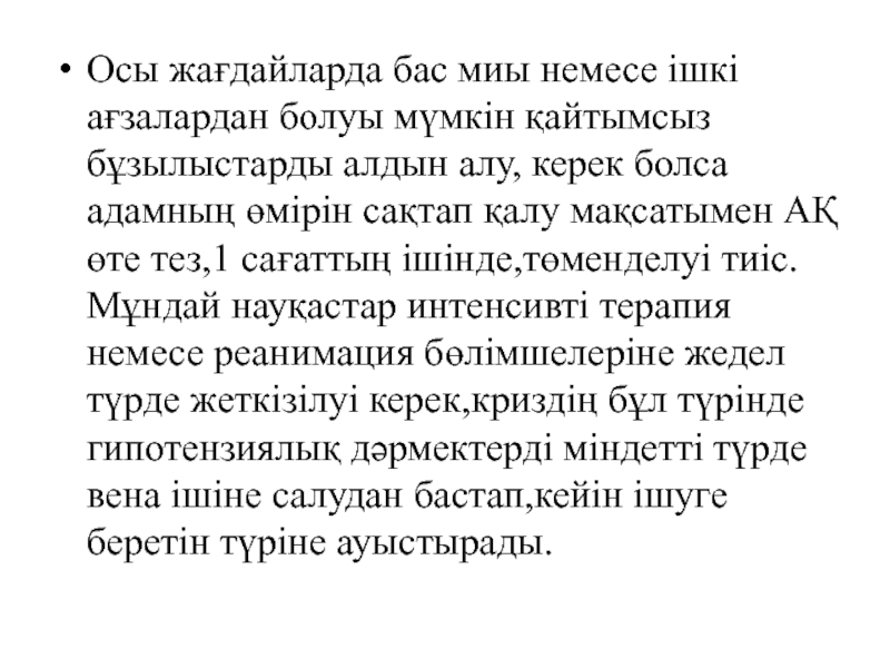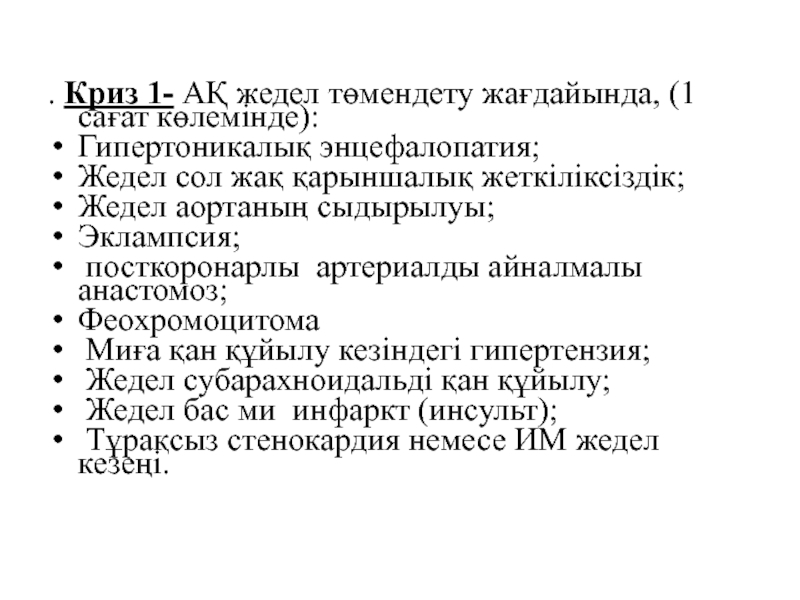 Слайд 10. Криз 1- АҚ жедел төмендету жағдайында, (1 сағат көлемінде):