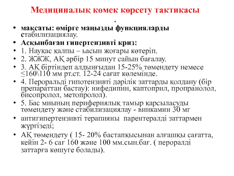 АҚ төмендету ( 15- 20% бастапқысынан алғашқы сағатта, кейін 2- 6 сағ 160 және 100 мм.сын.бағ. ( пероралді заттарға көшуге болады).