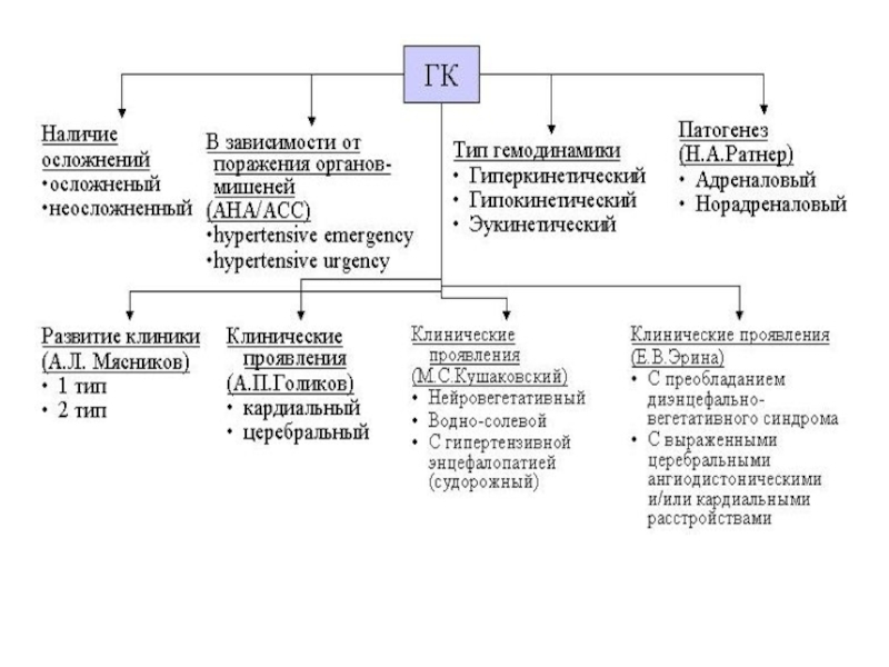 ГК тек артериялық гипертониямен емес, симптомдық гипертониямен сырқаттанатын науқастарда да дами береді. Гипертониялық криздер АҚ 160/95 мм с.б көтерілгенде де дамуы мүмкін, бірақ көбіне криз кезінде САҚ 190-270, ал ДАҚ 120-160 мм с.б дейін биіктейді. Негізінде криздің ауырлығы қысымының биіктеу деңгейіне емес, ми мен жүрек жағынан болатын бұзылыстардың ауырлығына тәуелді.