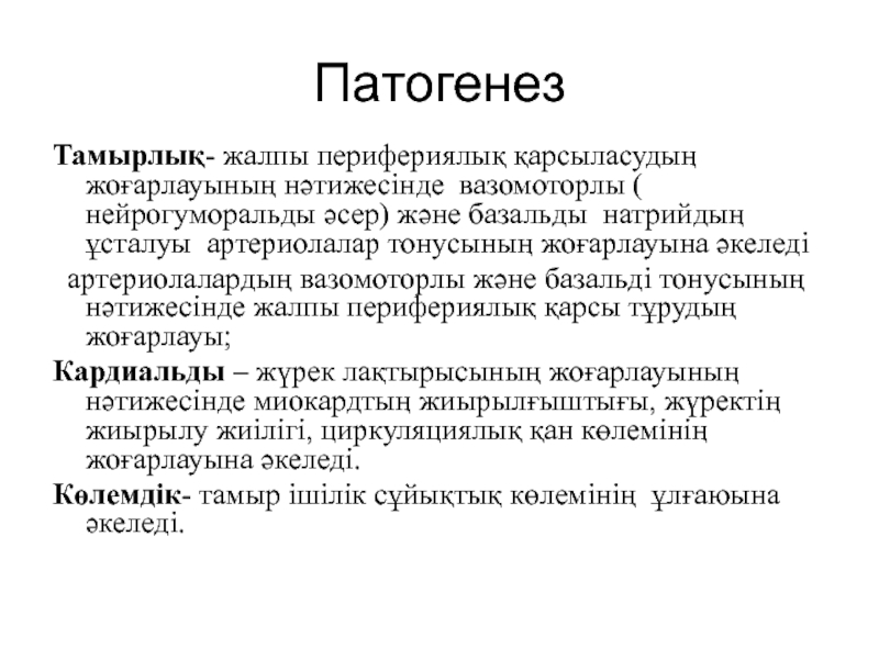 Тамырлық- жалпы перифериялық қарсыласудың жоғарлауының нәтижесінде вазомоторлы ( нейрогуморальды