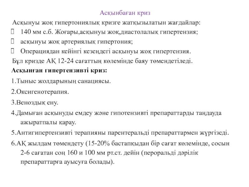 6.АҚ жылдам төмендету (15-20% бастапқыдан бір сағат көлемінде, сосын 2-6 сағатан соң 160 и 100 мм рт.ст. дейін (пероральді дәрілік препараттарға ауысуға болады).