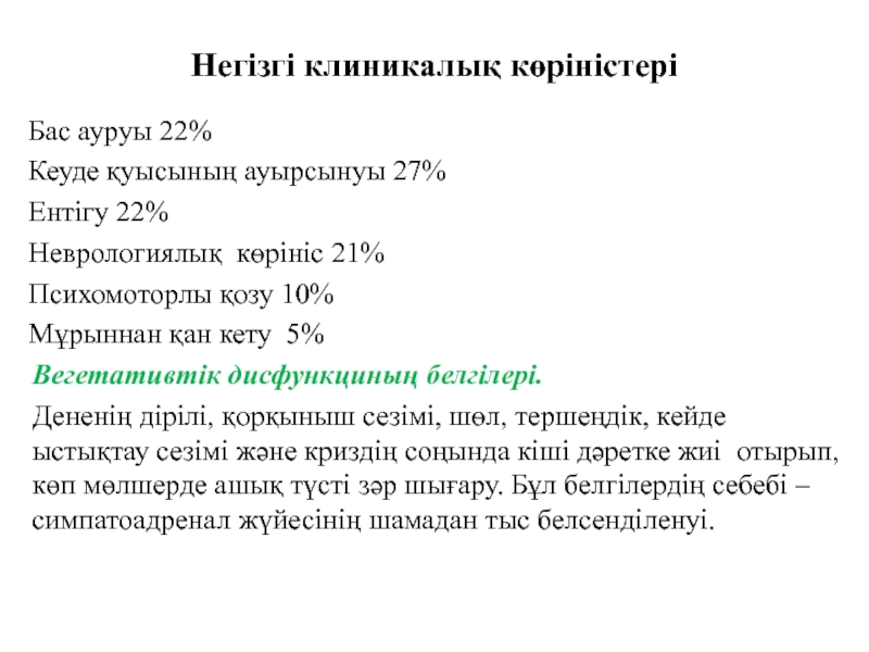 Вегетативті симптом : бас ауру, қозғыштық, жүрек қағу, дірілдеу,