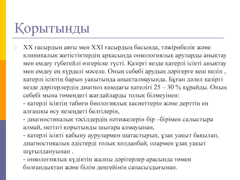 - онкологиялық күдіктің жалпы дәрігерлер арасында төмен болғандықтан және білім деңгейінің сапасыздығынан.