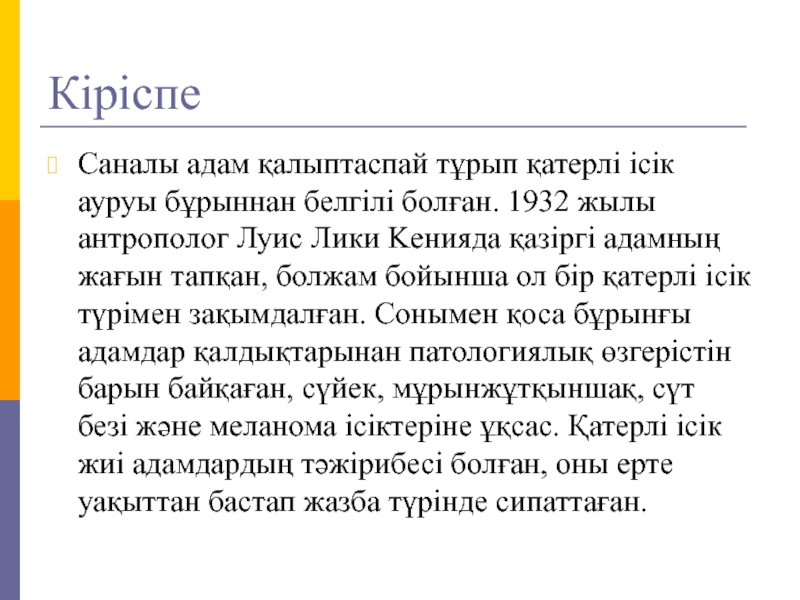Саналы адам қалыптаспай тұрып қатерлі ісік ауруы бұрыннан белгілі болған.