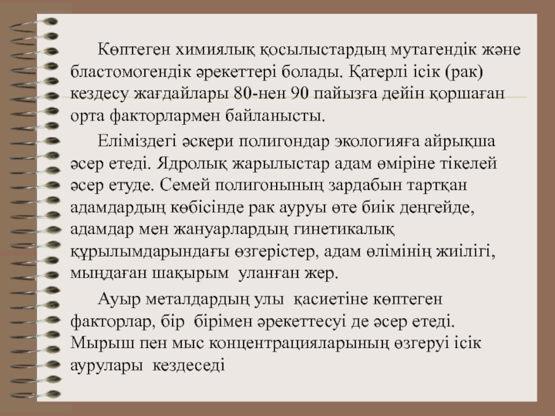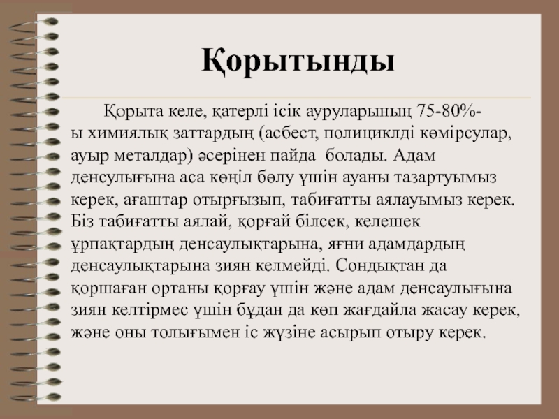 Слайд 16Қорыта келе, қатерлі ісік ауруларының 75-80%-ы химиялық заттардың (асбест, полициклді көмірсулар, ауыр