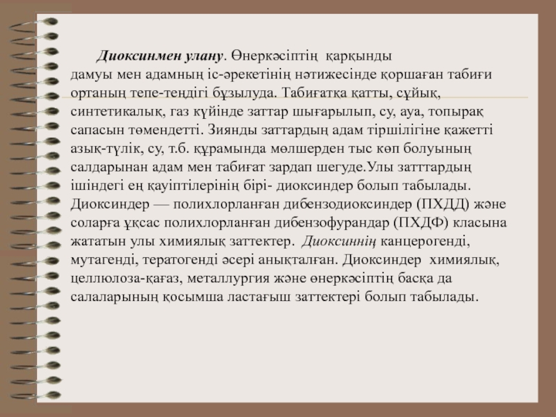 Слайд 11Диоксинмен улану. Өнеркәсіптің қарқынды дамуы мен адамның іс-әрекетінің нәтижесінде қоршаған табиғи ортаның тепе-теңдігі