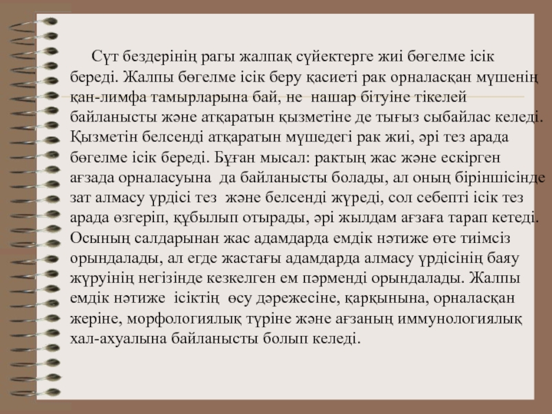 Слайд 5Сүт бездерінің рагы жалпақ сүйектерге жиі бөгелме ісік береді. Жалпы