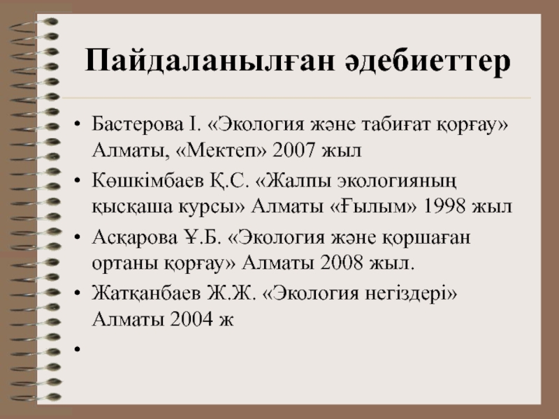 Слайд 17Бастерова І. «Экология және табиғат қорғау» Алматы, «Мектеп» 2007 жыл