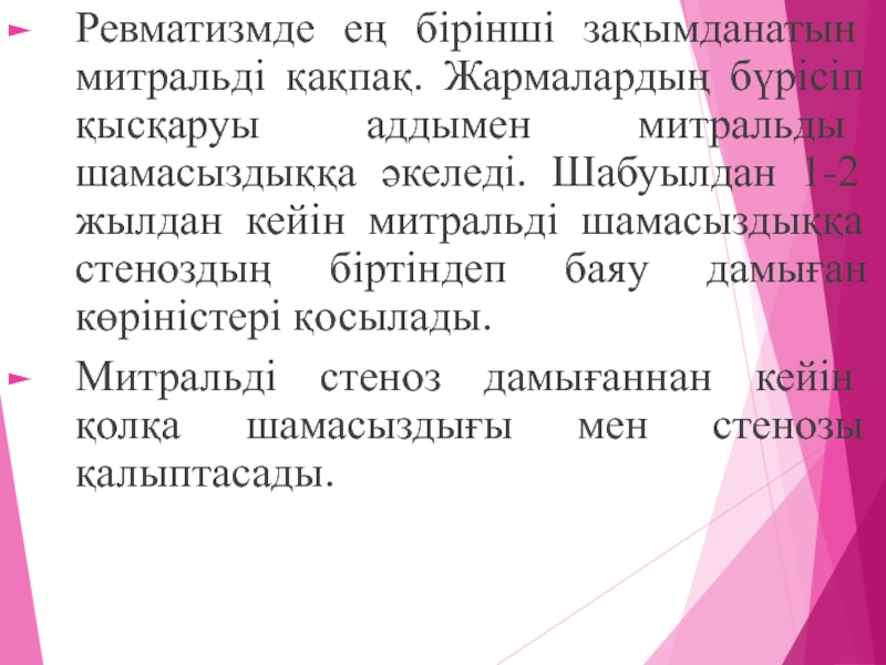 Слайд 21Ревматизмде ең бірінші зақымданатын митральді қақпақ. Жармалардың бүрісіп қысқаруы аддымен
