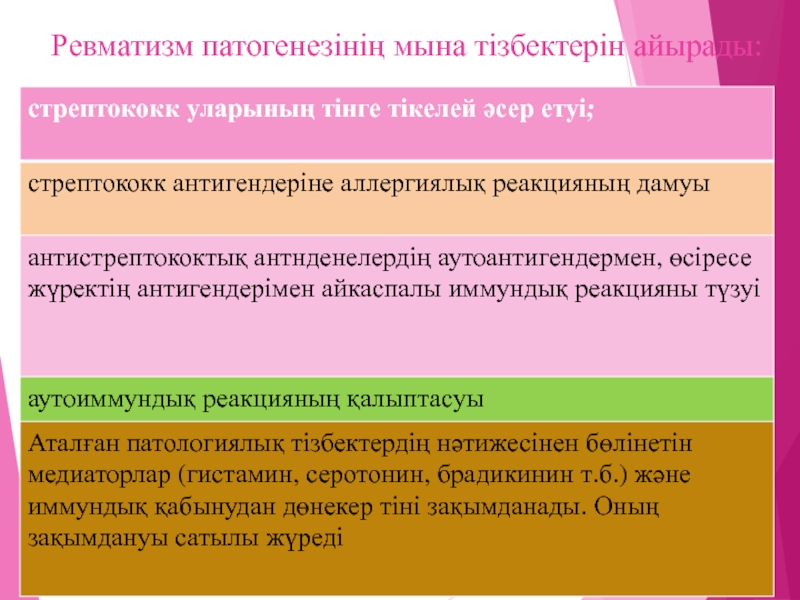 Слайд 12Ревматизм патогенезінің мына тізбектерін айырады: